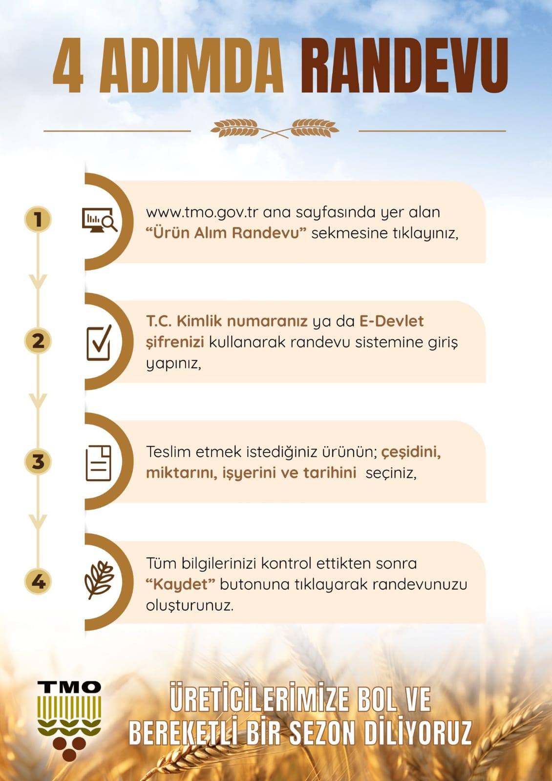 Ürün teslimatları yalnızca ürün sahibi ya da yasal temsilcisi tarafından yapılabilecektir. Hasat oranlarının artış göstermesiyle birlikte ilave randevular da açılacaktır. Bu nedenle üreticilerin hasat tarihlerine uygun randevu almaları kendi menfaatlerine olacaktır.