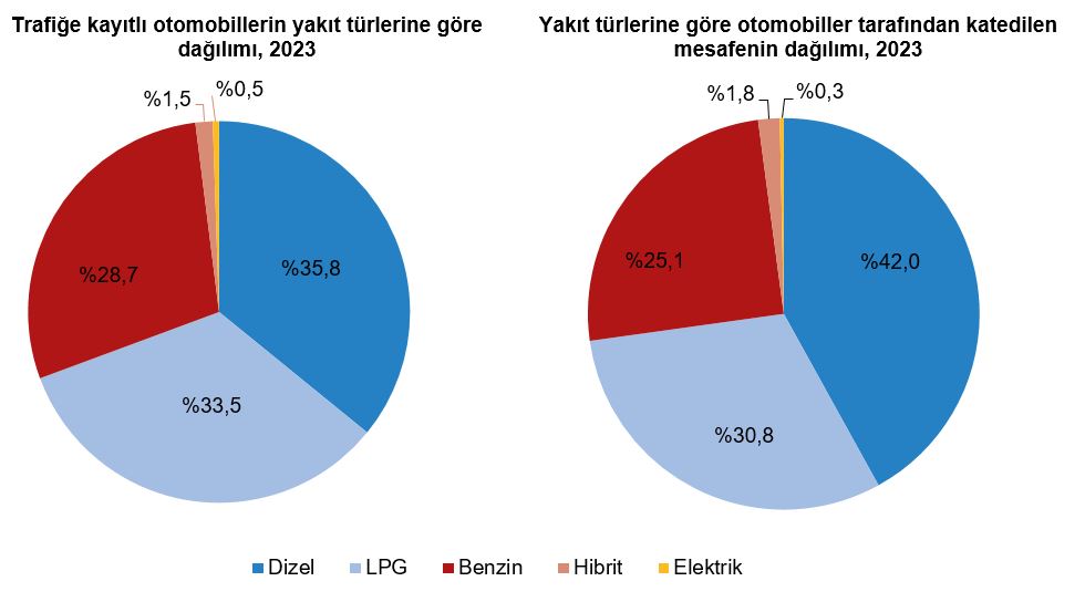Otomobiller tarafından 2023 yılında katedilen mesafe taşıtların yakıt türlerine göre incelendiğinde; toplam taşıt-km'nin %42,0'ı dizel, %30,8'i LPG'li, %25,1'i benzinli, %1,8'i hibrit ve %0,3'ü elektrikli otomobiller tarafından yapıldı.