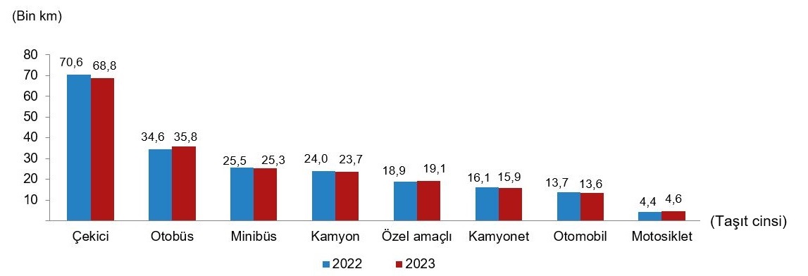 Taşıtların bir yılda yaptıkları ortalama kilometreler incelendiğinde; 2023 yılında sırasıyla çekicilerin 68 bin 785, otobüslerin 35 bin 808, minibüslerin 25 bin 268, kamyonların 23 bin 704, özel amaçlı taşıtların 19 bin 142, kamyonetlerin 15 bin 928, otomobillerin 13 bin 564 ve motosikletlerin 4 bin 554 kilometre yaptığı hesaplandı.