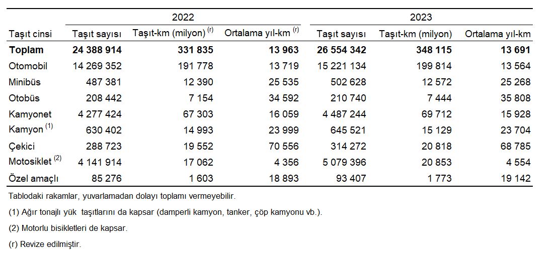 Türkiye'de 2023 yılında trafiğe kayıtlı toplam motorlu kara taşıtları sayısı bir önceki yıla göre %8,9 artarken toplam taşıt-km %4,9 artış gösterdi. Taşıt sayısı; motosikletlerde %22,6, özel amaçlı taşıtlarda %9,5, çekicilerde %8,8, otomobillerde %6,7, kamyonetlerde %4,9, minibüslerde %3,1, kamyonlarda %2,4, otobüslerde %1,1 artış gösterirken, taşıt-km motosikletlerde %22,2, özel amaçlı taşıtlarda %10,6, çekicilerde %6,5, otomobillerde %4,2, otobüslerde %4,1, kamyonetlerde %3,6, minibüslerde %1,5 ve kamyonlarda %0,9 arttı.