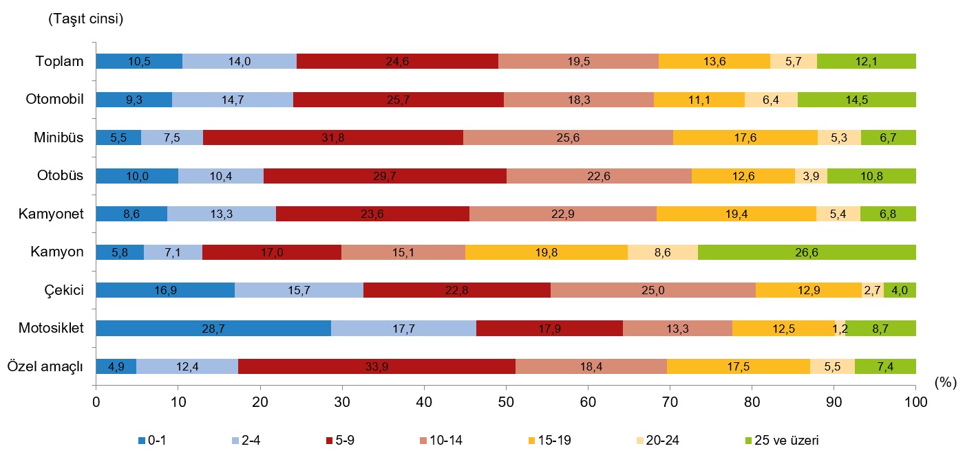 Türkiye'de 2023 yılında katedilen toplam mesafe taşıtların yaş gruplarına göre incelendiğinde; en fazla yol %24,6'lık oranla taşıt filosunun %19,8'ini oluşturan 5-9 yaş grubu taşıtlar tarafından yapılırken, bunu sırasıyla %19,5 ile 10-14 yaş, %14,0 ile 2-4 yaş, %13,6 ile 15-19 yaş, %12,1 ile 25 yaş ve üzeri, %10,5 ile 0-1 yaş ve %5,7 ile 20-24 yaş grubu taşıtlar takip etti. Bu oran otomobillerde 5-9 yaş otomobiller için %25,7, 10-14 yaş için %18,3, 2-4 yaş için %14,7, 25 yaş ve üzeri için %14,5, 14-19 yaş için %11,1, 0-1 yaş için %9,3 ve 20-24 yaş için ise %6,4 oldu.