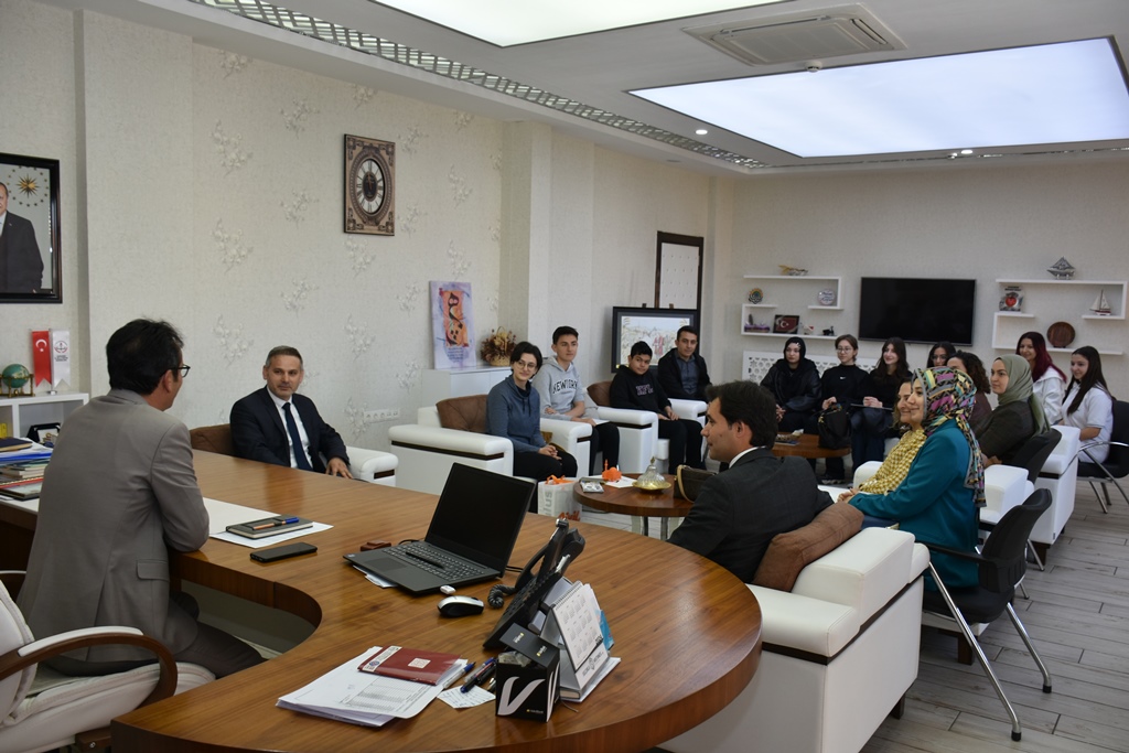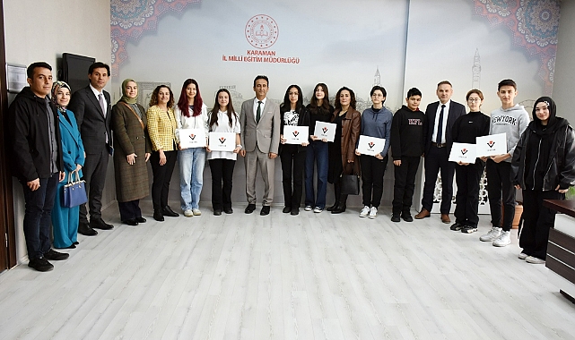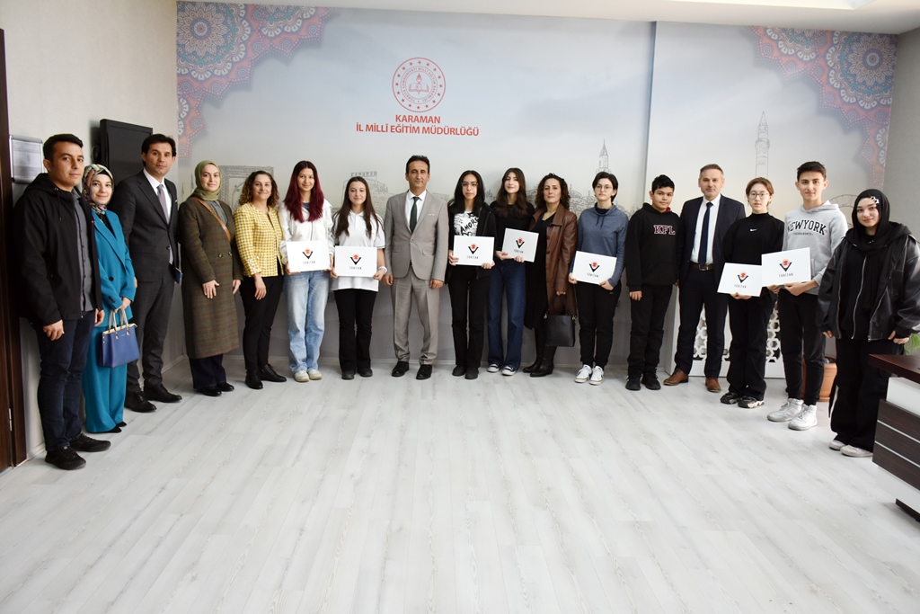 TÜBİTAK tarafından bu yıl 55'incisi düzenlenen Lise Öğrencileri Araştırma Projeleri Yarışmasına katılan ve bölge finalinden derecelerle geri dönen Karaman Bilim ve Sanat Merkezi öğrencileri, danışman öğretmenleri ile birlikte Karaman İl Milli Eğitim Müdürü Mehmet Çalışkan’ı ziyaret ederek projeleri hakkında bilgi verdiler.