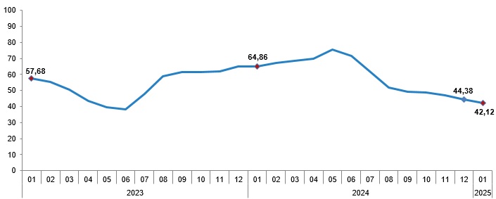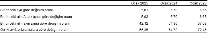 TÜFE'deki (2003=100) değişim 2025 yılı Ocak ayında bir önceki aya göre %5,03, bir önceki yılın Aralık ayına göre %5,03, bir önceki yılın aynı ayına göre %42,12 ve on iki aylık ortalamalara göre %56,35 olarak gerçekleşti.