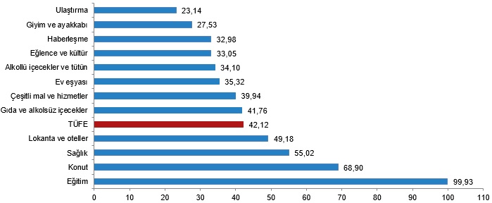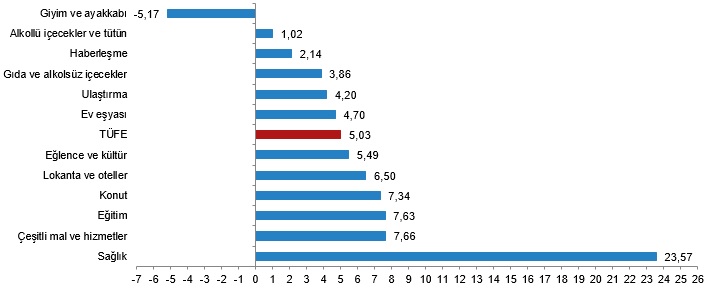 Bir önceki yılın aynı ayına göre en az artış gösteren ana grup %23,14 ile ulaştırma oldu. Buna karşılık, bir önceki yılın aynı ayına göre artışın en yüksek olduğu ana grup ise %99,93 ile eğitim oldu.