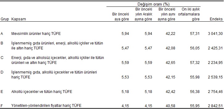 İşlenmemiş gıda ürünleri, enerji, alkollü içkiler ve tütün ile altın hariç TÜFE'deki değişim, 2025 yılı Ocak ayında bir önceki aya göre %5,47, bir önceki yılın Aralık ayına göre %5,47, bir önceki yılın aynı ayına göre %42,08 ve on iki aylık ortalamalara göre %56,05 olarak gerçekleşti.