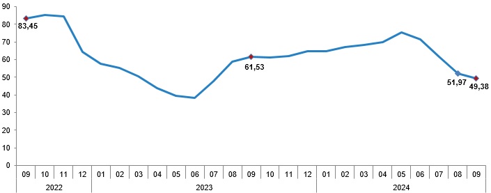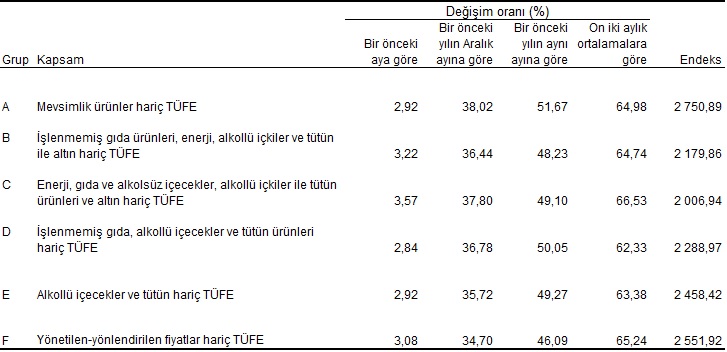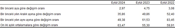 İşlenmemiş gıda ürünleri, enerji, alkollü içkiler ve tütün ile altın hariç TÜFE'deki değişim, 2024 yılı Eylül ayında bir önceki aya göre %3,22, bir önceki yılın Aralık ayına göre %36,44, bir önceki yılın aynı ayına göre %48,23 ve on iki aylık ortalamalara göre %64,74 olarak gerçekleşti.