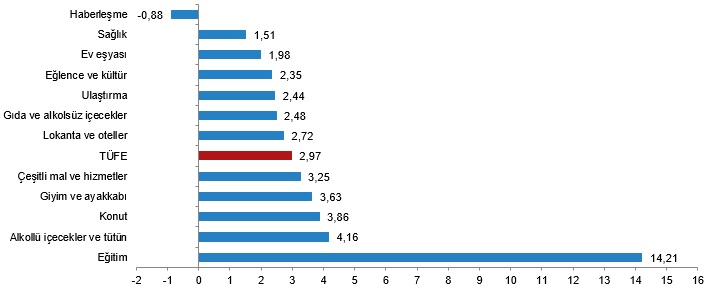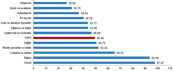 Bir önceki yılın aynı ayına göre en az artış gösteren ana grup %26,60 ile ulaştırma oldu. Buna karşılık, bir önceki yılın aynı ayına göre artışın en yüksek olduğu ana grup ise %97,87 ile konut oldu.
