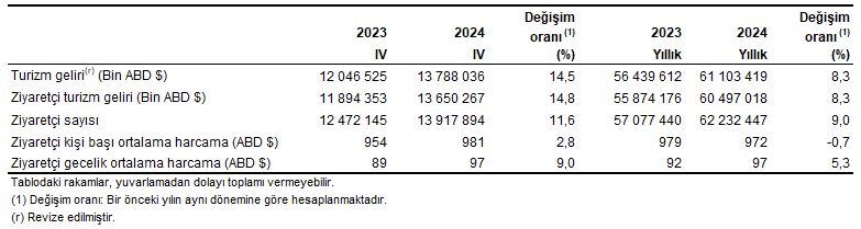 Turizm geliri ve ziyaretçi sayısı, IV. Çeyrek: Ekim-Aralık, 2024