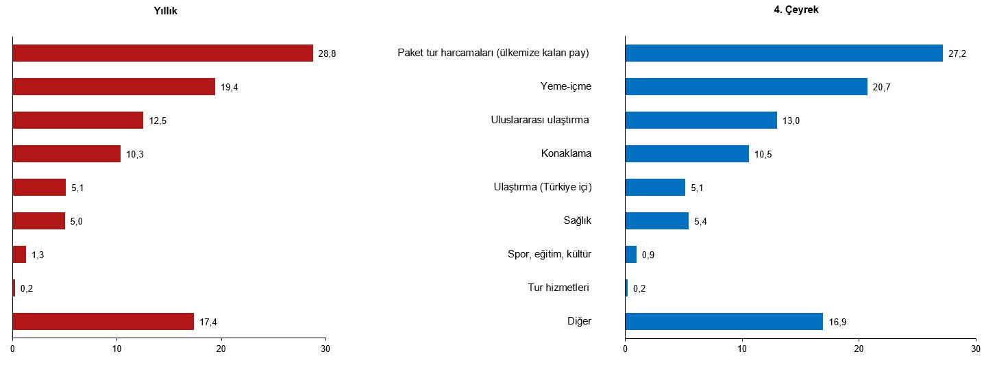 Bu yıl ziyaretçilerden elde edilen turizm geliri içerisindeki paket tur harcamalarının payı %28,8, yeme içme harcamalarının payı %19,4, uluslararası ulaştırma harcamalarının payı ise %12,5 oldu. Bir önceki yıla göre paket tur harcamaları %22,7, yeme içme harcamaları %7,4 ve uluslararası ulaştırma harcamaları ise %0,9 arttı. Bu çeyrekte ziyaretçilerden elde edilen turizm geliri içerisindeki paket tur harcamalarının payı %27,2, yeme içme harcamalarının payı %20,7, uluslararası ulaştırma harcamalarının payı ise %13 oldu. Bir önceki yılın aynı çeyreğine göre paket tur harcamaları %23,2, yeme içme harcamaları %26,3 ve uluslararası ulaştırma harcamaları %5,2 arttı.