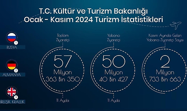 Türkiye 2024 yılının Kasım ayında da turizmdeki yükselişini sürdürüyor. Yılın 11 ayında toplam 57 milyon 363 bin 350 ziyaretçi ağırlandı.