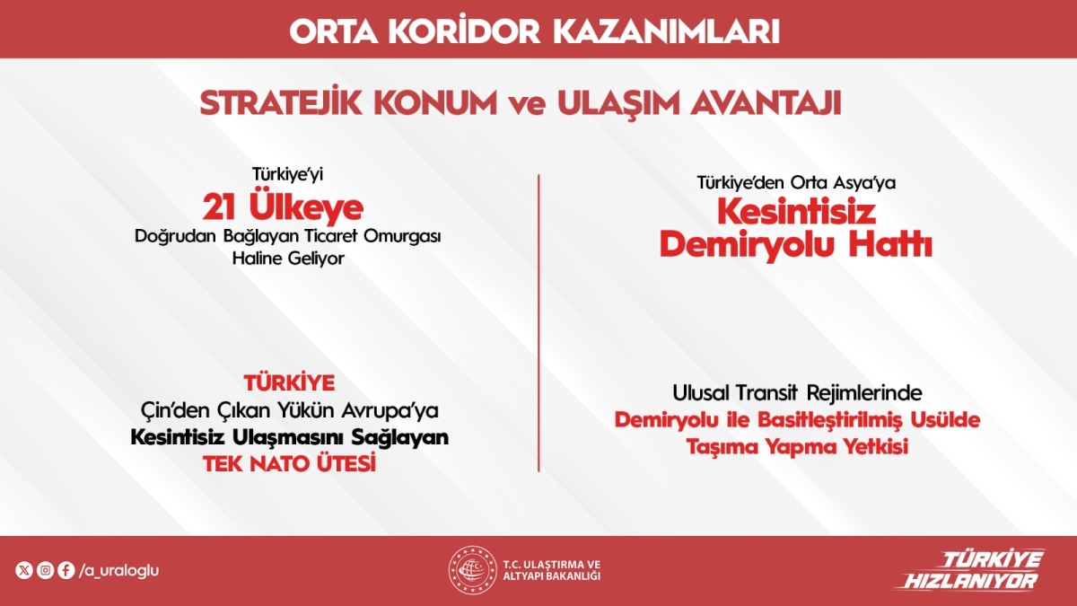 Açıklamasında Türkiye’nin jeostratejik konumunun altını çizen Bakan Uraloğlu, “Türkiye, doğu ile batı arasında sadece bir köprü değil, aynı zamanda güvenli ve verimli bir lojistik merkezi haline geliyor. Orta Koridor ile birlikte ülkemiz, küresel tedarik zincirlerinde belirleyici bir aktör olma yolunda ilerliyor.” ifadelerini kullandı.