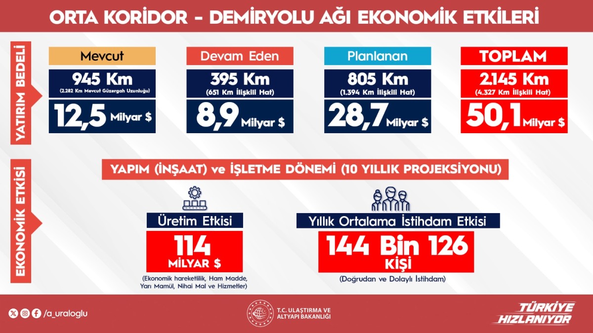 Uraloğlu, Orta Koridor’un 10 yıllık ekonomik etkilerine ilişkin de bilgi verdi. Yapılan projeksiyonlara göre, bu güzergâhın Türkiye ekonomisine üretim anlamında 114 milyar dolarlık katkı sağlayacağı tahmin ediliyor. Ayrıca bu projelerin doğrudan ve dolaylı etkisiyle yılda ortalama 144 bin 126 kişilik bir istihdam oluşturması bekleniyor.