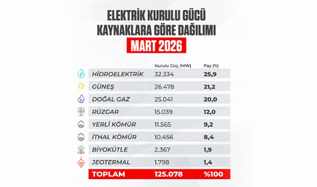 Türkiye’nin elektrik kurulu gücü, 2026 yılı mart ayı sonu itibarıyla 125 bin 78 megavata ulaştı. Toplam kurulu gücün 78 bin 281 megavatlık kısmını yenilenebilir enerji kaynakları oluştururken, bu oran %62,4 olarak kaydedildi.