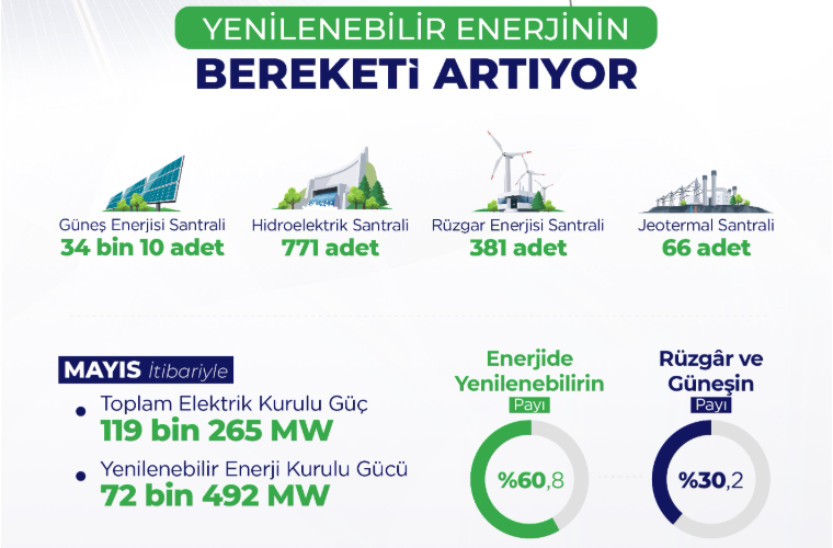 2024 yılı Mayıs ayında Türkiye’nin yenilenebilir enerji kurulu gücü 63 bin 502 MW olarak kaydedilirken, toplam kurulu güçteki payı yüzde 57,6 olarak gerçekleşti. Bu dönemde rüzgâr enerjisi 12 bin 194 MW, güneş enerjisi ise 14 bin 995 MW seviyesindeydi. Rüzgâr ve güneşin yenilenebilir kaynaklar içindeki toplam payı ise yüzde 24,7 olarak ölçüldü.
