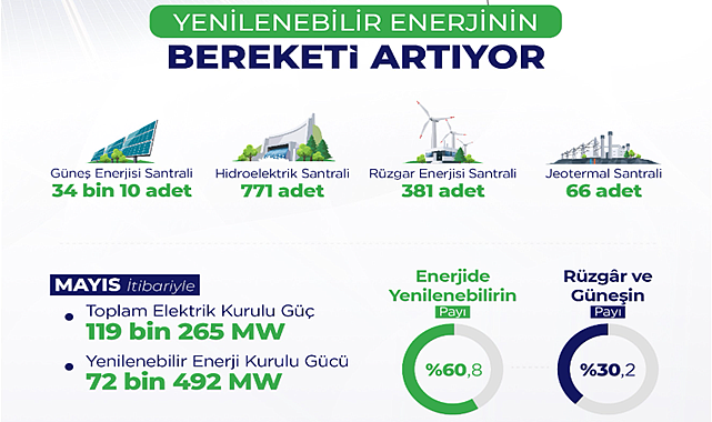 Bu verilerle birlikte yenilenebilir enerjinin toplam kurulu güç içindeki payı yüzde 60,8’e çıktı.