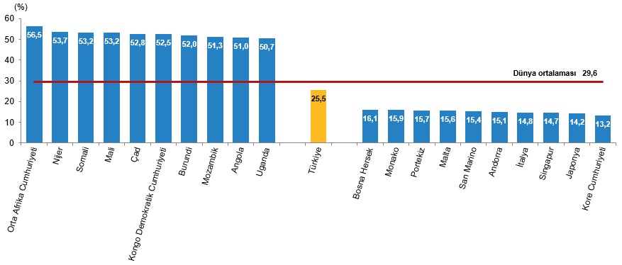 Türkiye hariç yıl ortası nüfuslardır. Çocuk nüfus oranının en yüksek olduğu ülke Orta Afrika Cumhuriyeti oldu Birleşmiş Milletler dünya nüfus tahminlerine göre ülkelerin toplam nüfusları içindeki 0-17 yaş grubu çocuk nüfus oranları incelendiğinde, 2024 yılında en yüksek çocuk nüfus oranına sahip olan ülke, %56,5 ile Orta Afrika Cumhuriyeti oldu. Bu ülkeyi %53,7 ile Nijer ve %53,2 ile Somali ve Mali izledi. Çocuk nüfus oranının en düşük olduğu ülke, %13,2 ile Kore Cumhuriyeti oldu. Bu ülkeyi %14,2 ile Japonya, %14,7 ile Singapur izledi. Çocuk nüfus oranı dünya ortalaması, 2024 yılında %29,6 oldu. Türkiye'deki çocuk nüfus oranının %25,5 ile dünya çocuk nüfus ortalamasının altında kaldığı görüldü. Çocuk nüfus oranının en yüksek ve en düşük olduğu 10 ülke, 2024