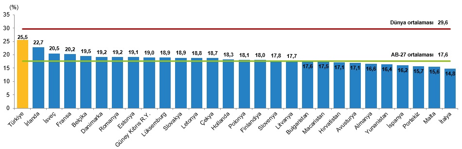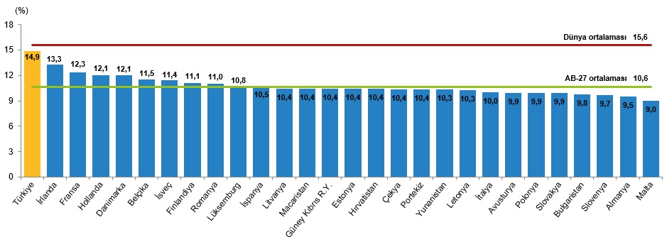 TÜİK, Adrese Dayalı Nüfus Kayıt Sistemi, 2024 Türkiye'nin genç nüfus oranının Avrupa Birliği üye ülkelerinden yüksek olduğu görüldü Birleşmiş Milletler dünya nüfus tahminlerine göre AB üyesi 27 ülkenin genç nüfus oranları incelendiğinde, 2024 yılında en yüksek genç nüfus oranına sahip olan ülkelerin sırasıyla %13,3 ile İrlanda, %12,3 ile Fransa, %12,1 ile Hollanda ve Danimarka olduğu görüldü. En düşük genç nüfus oranına sahip olan ülkelerin ise sırasıyla %9,0 ile Malta, %9,5 ile Almanya, %9,7 ile Slovenya olduğu görüldü. Türkiye'nin genç nüfus oranının %14,9 ile AB üyesi 27 ülkenin genç nüfus oranlarından daha yüksek olduğu görüldü. Genç nüfus oranının AB üye ülkeleri ile karşılaştırması, 2024