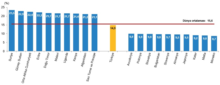 TÜİK, Adrese Dayalı Nüfus Kayıt Sistemi, 2024 Genç nüfus oranının en yüksek olduğu ülke Suriye oldu Birleşmiş Milletler dünya nüfus tahminlerine göre ülkelerin toplam nüfusları içindeki 15-24 yaş grubu genç nüfus oranları incelendiğinde, 2024 yılında en yüksek genç nüfus oranına sahip olan ülke, %23,5 ile Suriye oldu. Bu ülkeyi %22,9 ile Güney Sudan, %22,4 ile Orta Afrika Cumhuriyeti izledi. Genç nüfus oranının en düşük olduğu ülke, %8,7 ile Monako oldu. Bu ülkeyi %9,0 ile Malta, %9,2 ile Katar izledi. Genç nüfus oranı dünya ortalaması, 2024 yılında %15,6 oldu. Türkiye'nin genç nüfus oranın %14,9 ile dünya genç nüfus ortalamasının hemen altında olduğu görüldü. Genç nüfus oranının en yüksek ve en düşük olduğu 10 ülke, 2024