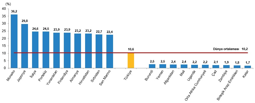 TÜİK, Adrese Dayalı Nüfus Kayıt Sistemi, 2024 Yaşlı nüfus oranının en yüksek olduğu ülke Monako oldu Birleşmiş Milletler dünya nüfus tahminlerine göre ülkelerin toplam nüfusları içindeki 65 ve daha yukarı yaştaki yaşlı nüfus oranları incelendiğinde, 2024 yılında en yüksek yaşlı nüfus oranına sahip olan ülke, %36,2 ile Monako oldu. Bu ülkeyi %29,8 ile Japonya, %24,6 ile İtalya izledi. Yaşlı nüfus oranının en düşük olduğu ülke, %1,7 ile Katar oldu. Bu ülkeyi %1,8 ile Birleşik Arap Emirlikleri, %1,9 ile Zambiya izledi. Yaşlı nüfus oranı dünya ortalaması, 2024 yılında %10,2 oldu. Türkiye'nin yaşlı nüfus oranının %10,6 ile dünya yaşlı nüfus ortalamasının hemen üzerinde olduğu görüldü. Yaşlı nüfus oranının en yüksek ve en düşük olduğu 10 ülke, 2024