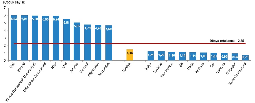TÜİK, Adrese Dayalı Nüfus Kayıt Sistemi, 2024 Toplam doğurganlık hızının en yüksek olduğu ülke 6,03 çocuk ile Çad oldu Birleşmiş Milletler dünya nüfus tahminlerine göre ülkelerin toplam doğurganlık hızları incelendiğinde, 2024 yılında en yüksek toplam doğurganlık hızına sahip olan ülke, 6,03 çocuk ile Çad oldu. Bu ülkeyi 6,01 çocuk ile Somali ve 5,98 çocuk ile Kongo Demokratik Cumhuriyeti izledi. Toplam doğurganlık hızının en düşük olduğu ülke, 0,73 çocuk ile Kore Cumhuriyeti oldu. Bu ülkeyi 0,95 çocuk ile Singapur ve 0,99 çocuk ile Ukrayna izledi. Toplam doğurganlık hızı dünya ortalaması, 2024 yılında 2,25 çocuk oldu. Türkiye'nin toplam doğurganlık hızının 1,48 çocuk ile dünya ortalamasının altında kaldığı görüldü. Toplam doğurganlık hızının en yüksek ve en düşük olduğu 10 ülke, 2024
