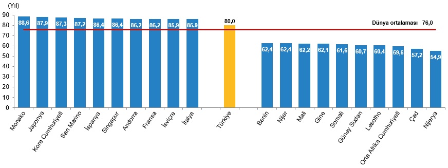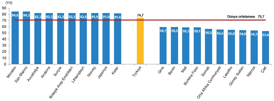 TÜİK, Doğum İstatistikleri, 2024 Erkekler için doğuşta beklenen yaşam süresinin en yüksek olduğu ülke Monako oldu Birleşmiş Milletler dünya nüfus tahminlerine göre 2024 yılı için doğuşta beklenen yaşam süresinin dünya genelinde 73,3 yıl, erkekler için 70,7 yıl ve kadınlar için 76,0 yıl olduğu görüldü. Ülkelerin 2024 yılı için doğuşta beklenen yaşam süreleri incelendiğinde, erkekler için doğuşta beklenen yaşam süresinin en yüksek olduğu ülke, 84,6 yıl ile Monako oldu. Bu ülkeyi 84,3 yıl ile San Marino ve 82,3 yıl ile Avustralya ve Andorra izledi. Erkekler için doğuşta beklenen yaşam süresinin en düşük olduğu ülke, 53,4 yıl ile Çad oldu. Bu ülkeyi 54,3 yıl ile Nijerya ve 54,8 yıl ile Güney Sudan izledi. Türkiye'nin erkekler için 74,7 yıl olan doğuşta beklenen yaşam süresinin dünya ortalamasından yüksek olduğu görüldü. Erkekler için doğuşta beklenen yaşam süresinin en yüksek ve en düşük olduğu 10 ülke, 2024