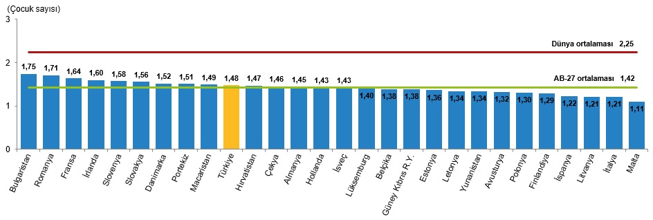 TÜİK, Doğum İstatistikleri, 2024 Toplam doğurganlık hızının en yüksek olduğu AB ülkesi 1,75 çocuk ile Bulgaristan oldu Birleşmiş Milletler dünya nüfus tahminlerine göre AB üyesi 27 ülkenin toplam doğurganlık hızları incelendiğinde, 2024 yılında en yüksek toplam doğurganlık hızına sahip olan ülke, 1,75 çocuk ile Bulgaristan oldu. Bu ülkeyi 1,71 çocuk ile Romanya ve 1,64 çocuk ile Fransa izledi. Toplam doğurganlık hızının en düşük olduğu ülke, 1,11 çocuk ile Malta oldu. Bu ülkeyi 1,21 çocuk ile İtalya ve Litvanya, 1,22 çocuk ile İspanya izledi. Toplam doğurganlık hızı 2024 yılında 1,48 çocuk olan Türkiye'nin, AB üyesi 27 ülke ortalamasından yüksek olduğu görüldü. Toplam doğurganlık hızının AB üye ülkeleri ile karşılaştırması, 2024