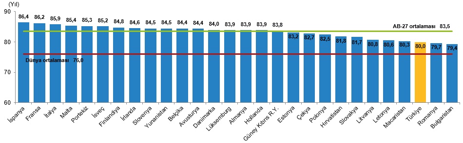 TÜİK, Hayat Tabloları, 2021-2023 Kadınlar için doğuşta beklenen yaşam süresinin en yüksek olduğu AB ülkesi İspanya oldu Birleşmiş Milletler dünya nüfus tahminlerine göre AB üyesi 27 ülkenin kadınlar için doğuşta beklenen yaşam süreleri incelendiğinde, kadınlar için 2024 yılı doğuşta beklenen yaşam süresinin en yüksek olduğu ülke, 86,4 yıl ile İspanya oldu. Bu ülkeyi 86,2 yıl ile Fransa, 85,9 yıl ile İtalya izledi. Doğuşta beklenen yaşam süresinin en düşük olduğu ülke, 79,4 yıl ile Bulgaristan oldu. Bu ülkeyi 79,7 yıl ile Romanya ve 80,3 yıl ile Macaristan izledi. Türkiye'nin kadınlar için 80,0 yıl olan doğuşta beklenen yaşam süresinin AB üyesi 27 ülke ortalamasından düşük olduğu görüldü. Kadınlar için doğuşta beklenen yaşam süresinin AB üye ülkeleri ile karşılaştırması, 2024