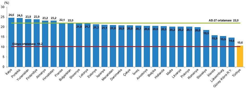 TÜİK, Adrese Dayalı Nüfus Kayıt Sistemi, 2024 Türkiye'nin yaşlı nüfus oranının Avrupa Birliği üye ülkelerinden düşük olduğu görüldü Birleşmiş Milletler dünya nüfus tahminlerine göre AB üyesi 27 ülkenin yaşlı nüfus oranları incelendiğinde, 2024 yılında en yüksek yaşlı nüfus oranına sahip olan ülkelerin sırasıyla %24,6 ile İtalya, %24,5 ile Portekiz ve %23,9 ile Yunanistan ve Finlandiya olduğu görüldü. En düşük yaşlı nüfus oranına sahip olan ülkelerin ise sırasıyla %14,6 ile Güney Kıbrıs Rum Yönetimi, %15,5 ile Lüksemburg, %15,9 ile İrlanda olduğu görüldü. Türkiye'nin yaşlı nüfus oranının %10,6 ile AB üyesi 27 ülkenin yaşlı nüfus oranlarından daha düşük olduğu görüldü. Yaşlı nüfus oranının AB üye ülkeleri ile karşılaştırması, 2024