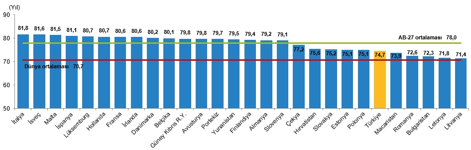 TÜİK, Hayat Tabloları, 2021-2023 Erkekler için doğuşta beklenen yaşam süresinin en yüksek olduğu AB ülkesi İtalya oldu Birleşmiş Milletler dünya nüfus tahminlerine göre AB üyesi 27 ülkenin erkekler için doğuşta beklenen yaşam süreleri incelendiğinde, erkekler için 2024 yılı doğuşta beklenen yaşam süresinin en yüksek olduğu ülke, 81,8 yıl ile İtalya oldu. Bu ülkeyi 81,6 yıl ile İsveç ve 81,5 yıl ile Malta izledi. Erkekler için doğuşta beklenen yaşam süresinin en düşük olduğu ülke, 71,4 yıl ile Litvanya oldu. Bu ülkeyi 71,8 yıl ile Letonya, 72,3 yıl ile Bulgaristan izledi. Türkiye'nin erkekler için 74,7 yıl olan doğuşta beklenen yaşam süresinin AB üyesi 27 ülke ortalamasından düşük olduğu görüldü. Erkekler için doğuşta beklenen yaşam süresinin AB üye ülkeleri ile karşılaştırması, 2024