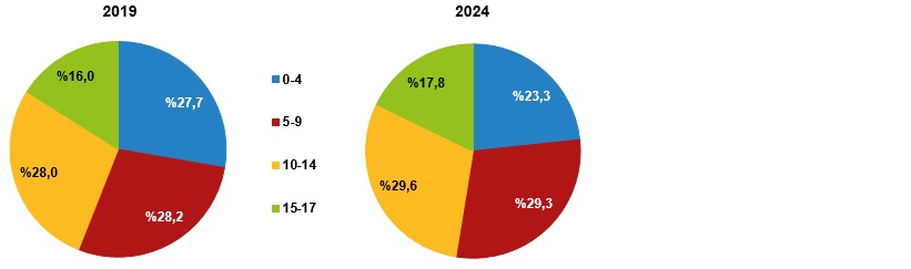 Kaynak: TÜİK, Adrese Dayalı Nüfus Kayıt Sistemi, 2024 Türkiye'de 0-17 yaş grubunda en az bir çocuk bulunan hanehalkı oranı %42,8 oldu ADNKS sonuçlarına göre 2024 yılında toplam hanehalkı sayısı 26 milyon 599 bin 261 oldu. Hanelerin %42,8'inde 0-17 yaş grubunda en az bir çocuk bulunduğu görüldü. Bu hanelerin illere göre dağılımı incelendiğinde, 0-17 yaş grubunda en az bir çocuk bulunan hanehalkı oranının en yüksek olduğu ilin %68,5 ile Şanlıurfa, en düşük olduğu ilin %28,2 ile Tunceli olduğu görüldü. Hanelerin %19,0'ında 0-17 yaş grubunda bir çocuk, %14,6'sında iki çocuk, %6,0'ında üç çocuk, %2,0'ında dört çocuk, %1,1'inde ise beş ve daha fazla çocuk bulunduğu görüldü. Çocuk nüfusun 2024 yılında %29,6'sının 10-14 yaş grubunda yer aldığı görüldü Çocuk nüfus yaş grubuna göre incelendiğinde, 2019 yılında çocuk nüfusun %27,7'sinin 0-4 yaş grubunda, %28,2'sinin 5-9 yaş grubunda, %28,0'ının 10-14 yaş grubunda ve %16,0'ının 15-17 yaş grubunda yer aldığı görülürken, 2024 yılında %23,3'ünün 0-4 yaş grubunda, %29,3'ünün 5-9 yaş grubunda, %29,6'sının 10-14 yaş grubunda ve %17,8'inin 15-17 yaş grubunda yer aldığı görüldü. Yaş grubuna göre çocuk nüfus oranı, 2019, 2024