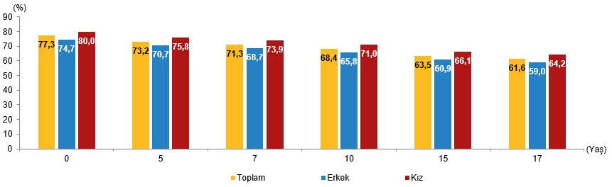 Grafikteki rakamlar, yuvarlamadan dolayı toplamı vermeyebilir. Canlı doğan bebek sayısı 2023 yılında 958 bin 408 oldu Doğum İstatistiklerine göre 2023 yılında canlı doğan bebek sayısı, 958 bin 408 oldu. Doğan bebeklerin 491 bin 361'i erkek, 467 bin 47'si ise kız oldu. Canlı doğan bebeklerin %96,7'sini tekil, %3,1'ini ikiz, %0,1'ini ise üçüz ve daha fazla çoğul doğumlar oluşturdu. Sağlık Bakanlığı verilerine göre hastanede gerçekleşen doğumların oranı, 2010 yılında %91,6 iken 2023 yılında %97,5 oldu. Beşli karma aşı (DPT+IPV+Hib) 3 doz ile aşılama oranı 2022 yılında %99,5 iken 2023 yılında %98,8 oldu. Beklenen yaşam süresi 15 yaşındaki çocuklar için 63,5 yıl oldu Hayat Tabloları, 2021-2023 sonuçlarına göre doğuşta beklenen yaşam süresi, Türkiye geneli için 77,3 yıl, erkekler için 74,7 yıl ve kadınlar için 80,0 yıl oldu. Türkiye'de 7 yaşına ulaşan bir çocuğun kalan yaşam süresinin ortalama 71,3 yıl, erkek çocuklar için 68,7 yıl ve kız çocuklar için 73,9 yıl olduğu görüldü. Çalışma çağının başlangıcı olan 15 yaşındaki çocuklar için bu süre 63,5 yıl oldu. Erkek çocuklar için bu süre 60,9 yıl iken kız çocuklar için 66,1 yıl oldu. Bu yaş için kız ve erkek çocuklar arasındaki beklenen yaşam süresi farkının 5,2 yıl olduğu görüldü. Yaşa ve cinsiyete göre çocuklarda beklenen yaşam süresi, 2021-2023