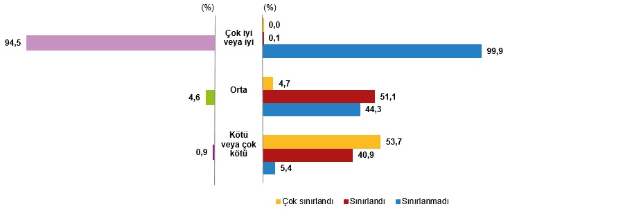 Kaynak: TÜİK, Ulusal Eğitim İstatistikleri Veri Tabanı, 2018/'19, 2023/'24 Özel eğitim alan öğrencilerin oranı %3,0 oldu Milli Eğitim Bakanlığı Örgün Eğitim İstatistiklerine göre Türkiye genelinde 2023/'24 eğitim ve öğretim döneminde örgün eğitime devam eden öğrenci sayısı 18 milyon 710 bin 265 oldu. Bu öğrencilerin %51,3'ünü erkek öğrenciler, %48,7'sini ise kız öğrenciler oluşturdu. Özel eğitim gerektiren bireylere (işitme, görme, ortopedik ve hafif düzeyde zihinsel engelli) hizmet veren, özel olarak yetiştirilmiş personelin bulunduğu, geliştirilmiş eğitim programlarının uygulandığı özel öğretim kurumlarında örgün eğitime devam eden öğrenci sayısı ise 559 bin 725 oldu. Özel eğitim alan öğrenciler örgün eğitimdeki öğrencilerin %3,0'ını oluşturdu. Özel örgün eğitime devam eden öğrencilerin %63,0'ını erkek öğrenciler, %37,0'ını ise kız öğrenciler oluşturdu. Çocukların %94,5'inin sağlık durumunun "çok iyi veya iyi" durumda olduğu görüldü Gelir ve Yaşam Koşulları Araştırması, Çocuk Sağlığı ve Yoksunluğu Modülü sonuçlarına göre 2024 yılında hanelerde yaşayan 15 yaş ve altı çocukların genel sağlık durumları incelendiğinde %94,5'inin "çok iyi veya iyi", %4,6'sının "orta", %0,9'unun ise "kötü veya çok kötü" olduğu görüldü. Çocukların en az son 6 ay içinde sağlık durumlarının günlük faaliyetlerini sınırlama durumları incelendiğinde sağlık durumu kötü veya çok kötü olan çocukların %53,7'sinin yaşanan sağlık sorunu nedeniyle günlük faaliyetlerinin çok sınırlandığı, %40,9'unun günlük faaliyetlerinin sınırlandığı, %5,4'ünün ise günlük faaliyetlerinin sınırlanmadığı beyan edildi. Çocukların genel sağlık durumları ve günlük faaliyetlerinin sınırlanma düzeyi, 2024