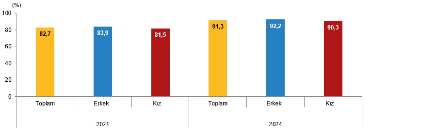 Grafikteki rakamlar, yuvarlamadan dolayı toplamı vermeyebilir. Çocukların İnternet kullanım oranı 2024 yılında %91,3 oldu Çocuklarda Bilişim Teknolojileri Kullanım Araştırması sonuçlarına göre İnternet kullanım oranı, 6-15 yaş grubundaki çocuklar için 2021 yılında %82,7 iken 2024 yılında %91,3 oldu. İnternet kullanımı cinsiyete göre incelendiğinde, erkek çocukların İnternet kullanım oranı 2021 yılında %83,9 iken 2024 yılında %92,2, kız çocukların İnternet kullanım oranı ise 2021 yılında %81,5 iken 2024 yılında %90,3 olduğu görüldü. Cinsiyete göre çocukların İnternet kullanım oranı, 2021, 2024