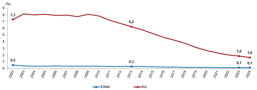 Kaynak: TÜİK, Çocuklarda Bilişim Teknolojileri Kullanım Araştırması, 2024 Yaş grubu 15-17 olan çocukların işgücüne katılma oranı %24,9 oldu Hanehalkı İşgücü Araştırması 2024 yılı sonuçlarına göre 15-17 yaş grubundaki çocukların işgücüne katılma oranı %24,9 oldu. İşgücüne katılma oranı cinsiyete göre incelendiğinde, bu oran erkek çocuklar için %35,6, kız çocuklar için %13,7 olduğu görüldü. Resmi kız çocuk evlilikleri azaldı Evlenme İstatistiklerine göre 16-17 yaş grubunda olan kız çocuklarının resmi evlenmelerinin toplam resmi evlenmeler içindeki oranı 2002 yılında %7,3 iken bu oran 2024 yılında %1,6'ya düştü. Diğer taraftan, aynı yaş grubunda olan erkek çocukların resmi evlenmelerinin toplam resmi evlenmeler içindeki oranı 2002 yılında %0,5 iken bu oran 2024 yılında %0,1 oldu. Cinsiyete göre çocuk evlenmelerinin toplam evlenmeler içindeki oranı, 2002-2024
