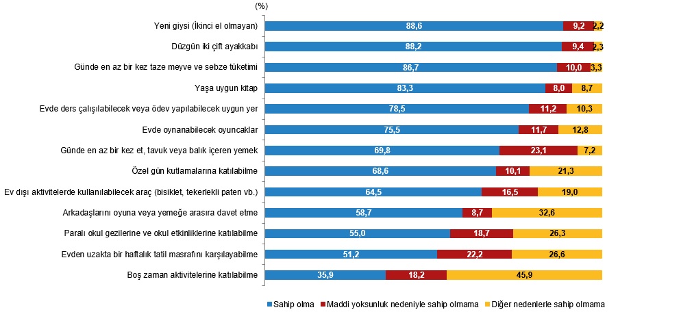 Grafikteki rakamlar, yuvarlamadan dolayı toplamı vermeyebilir. Hanehalklarının %9,2'sinde çocuklar maddi yetersizlik nedeniyle yeni giysilere sahip olamadı Gelir ve Yaşam Koşulları Araştırması, Çocuk Sağlığı ve Yoksunluğu Modülü sonuçlarına göre 2024 yılında, 15 yaş ve altı tüm çocukların yeni giysilere sahip olduğu hanehalkı oranı %88,6 iken maddi yetersizlik nedeniyle çocukları yeni giysilere sahip olamayan hanehalkı oranı %9,2, diğer nedenlerle çocukları yeni giysilere sahip olamayan hanehalkı oranı ise %2,2 oldu. Günde en az bir kez taze meyve ve sebze tüketimi yapabilen 15 yaş ve altı çocukların bulunduğu hanehalklarının oranı %86,7, maddi yetersizlikler nedeniyle günde en az bir kez taze sebze ve meyve tüketimi yapamayan hanehalkı oranı %10,0, diğer nedenlerle çocukları günde en az bir kez taze meyve ve sebze tüketemeyen hanehalkı oranı ise %3,3 oldu. Çocukları için evden uzakta bir haftalık tatil masrafını karşılayabilen hanehalkı oranı %51,2, maddi yetersizlikler nedeniyle evden uzakta bir haftalık tatil masrafını karşılayamayan hanehalkı oranı %22,2, diğer nedenlerle evden uzakta bir haftalık tatil masrafını karşılayamayan hanehalkı oranı ise %26,6 oldu. Hanehalklarının ihtiyaç gruplarına sahip olma durumu, 2024