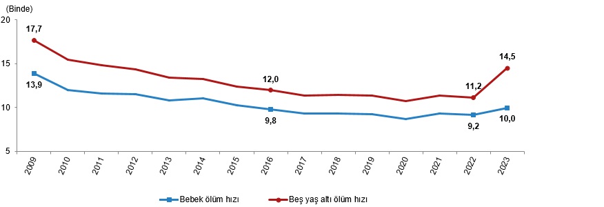 Grafikteki rakamlar, yuvarlamadan dolayı toplamı vermeyebilir. Bebek ölüm hızı binde 10,0 oldu Ölüm ve Ölüm Nedeni İstatistiklerine göre 2009 yılında bebek ölüm hızı binde 13,9 iken 2023 yılında binde 10,0 oldu. Doğumdan sonraki beş yıl içinde ölme olasılığını ifade eden beş yaş altı ölüm hızı, 2009 yılında binde 17,7 iken 2023 yılında binde 14,5 oldu. Bebek ve beş yaş altı ölüm hızı, 2009-2023
