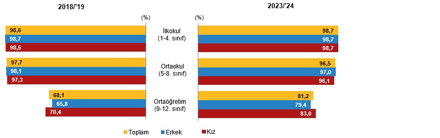 Kaynak: Milli Eğitim Bakanlığı, Milli Eğitim İstatistikleri, Örgün Eğitim, 2023/'24 İlkokul tamamlama oranı %98,7 oldu Ulusal Eğitim İstatistikleri Veri Tabanı sonuçlarına göre eğitim kademesi ve cinsiyete göre okul tamamlama oranları incelendiğinde, yıllara göre bir artış gözlendi. İlkokul tamamlama oranı 2018/'19 eğitim ve öğretim döneminde %98,6 iken bu oran 2023/'24 eğitim ve öğretim döneminde %98,7 oldu. Ortaokul tamamlama oranı 2018/'19 eğitim ve öğretim döneminde %97,7 iken bu oran 2023/'24 eğitim ve öğretim döneminde %96,5 oldu. Ortaöğretim tamamlama oranı ise %68,1'den %81,2'ye yükseldi. Ortaöğretim okul tamamlama oranı cinsiyete göre incelendiğinde, 2023/'24 eğitim ve öğretim döneminde bu oranın erkek çocuklar için %79,4, kız çocuklar için %83,0 olduğu görüldü. Eğitim kademesi ve cinsiyete göre okul tamamlama oranı, 2018/'19, 2023/'24