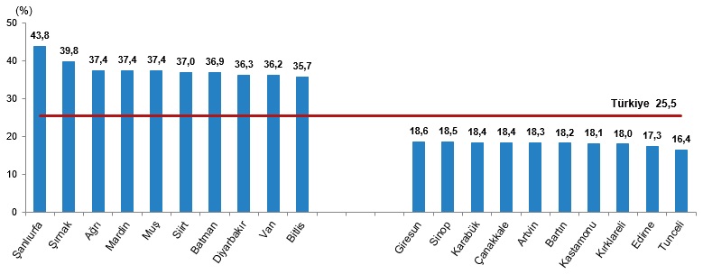 Kaynak: TÜİK, Adrese Dayalı Nüfus Kayıt Sistemi, 2024 Çocuk nüfus oranının en düşük olduğu il, %16,4 ile Tunceli oldu. Tunceli ilini %17,3 ile Edirne ve %18,0 ile Kırklareli izledi. İllere göre çocuk nüfus oranı, 2024