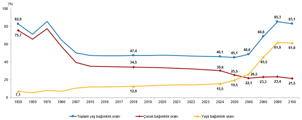 Kaynak: TÜİK, Hayat tabloları, 2021-2023 Bebeklere konulan en popüler erkek ismi Alparslan, kız ismi Defne oldu ADNKS sonuçlarına göre 2024 yılında doğan bebeklere konulan en popüler erkek bebek isimleri, Alparslan, Göktuğ ve Yusuf; en popüler kız bebek isimleri ise Defne, Asel ve Zeynep oldu. Doğan erkek bebeklerin 8 bin 88'ine Alparslan, 5 bin 683'üne Göktuğ, 4 bin 880'ine Yusuf, kız bebeklerin 7 bin 466'sına Defne, 7 bin 347'sine Asel, 6 bin 540'ına ise Zeynep ismi verildi. Türkiye'de 2024 yılında 0-17 yaş grubundaki çocuklarda en çok kullanılan erkek çocuk isimlerinin Yusuf, Mustafa ve Ömer; kız çocuk isimlerinin ise Zeynep, Elif ve Ecrin olduğu görüldü. Çocuk bağımlılık oranı 2024 yılında %30,6 oldu Toplam yaş bağımlılık oranı, 15-64 yaş grubunda çalışma çağındaki her 100 kişi başına düşen, 0-14 ile 65 ve üzeri yaş grubundaki kişi sayısı olarak tanımlanır. ADNKS sonuçlarına göre 2024 yılında toplam yaş bağımlılık oranı %46,1 oldu. Yaş grubu 15-64 olan her 100 kişi başına düşen, 0-14 yaş grubundaki çocuk sayısını ifade eden çocuk bağımlılık oranı ise %30,6 olarak gerçekleşti. Çocuk bağımlılık oranı, 1935-2100