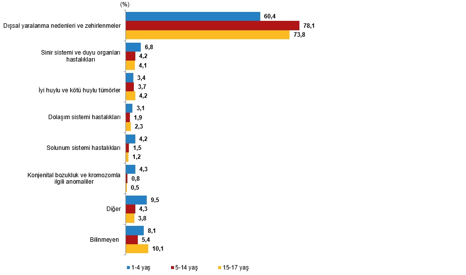Kaynak: TÜİK, Evlenme İstatistikleri, 2002-2024 Babası vefat etmiş çocukların sayısı 258 bin 515 oldu ADNKS sonuçlarına göre 2024 yılında 21 milyon 817 bin 61 çocuk nüfusun içinde babası vefat etmiş çocuk sayısının 258 bin 515, annesi vefat etmiş çocuk sayısının 81 bin 373, hem annesi hem de babası vefat etmiş çocuk sayısının ise 5 bin 276 olduğu görüldü. Koruyucu aile yanında bakımı sağlanan çocuk sayısı 10 bin 430 oldu Aile ve Sosyal Hizmetler Bakanlığının verilerine göre 2024 yılında Türkiye genelinde kuruluş bakımı altında bulunan çocuk sayısının 15 bin 135 olduğu görüldü. Mevcut koruyucu aile sayısı 8 bin 719, koruyucu aile yanında bakımı sağlanan çocuk sayısı ise 10 bin 430 oldu. Evlat edindirilen çocuk sayısı 2024 yılında 589 oldu. Boşanma davaları sonucu, velayeti anneye verilen çocukların oranı %74,4 oldu Boşanma İstatistiklerine göre 2024 yılında boşanan çiftlerin sayısı 187 bin 343 oldu. Kesinleşen boşanma davaları sonucunda 186 bin 536 çocuk velayete verildi. Çocukların velayetinin %74,4'ünün anneye, %25,6'sının ise babaya verildiği görüldü. Çocuklar en fazla dışsal yaralanma ve zehirlenmeler nedeniyle hayatını kaybetti Ölüm ve Ölüm Nedeni İstatistiklerine göre 2023 yılında 1-17 yaş grubunda çocuk ölümleri en fazla, dışsal yaralanma ve zehirlenmeler nedeniyle gerçekleşti. Söz konusu nedenle hayatını kaybeden 1-17 yaş grubundaki çocuk sayısı, 2023 yılında 13 bin 43 oldu. Sinir sistemi ve duyu organları hastalıkları nedeniyle 866 çocuk, iyi huylu ve kötü huylu tümörler nedeniyle 671 çocuk, dolaşım sistemi hastalıkları nedeniyle 403 çocuk hayatını kaybetti. Ölüm nedeni ve yaş grubuna göre ölen çocukların oranı, 2023
