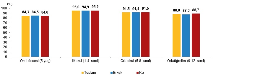 TÜİK, 2024 Nüfus Projeksiyonları Ana Senaryo, 2030-2100 Beş yaşındaki çocukların net okullaşma oranı %84,3 oldu Milli Eğitim Bakanlığı Örgün Eğitim İstatistiklerine göre okul öncesi eğitim seviyesinde beş yaş net okullaşma oranının, 2022/'23 öğretim yılında %85,0 iken 2023/'24 öğretim yılında %84,3 olduğu görüldü. Beş yaş net okullaşma oranı cinsiyete göre incelendiğinde, bu oran erkek çocuklar için %84,5, kız çocuklar için %84,0 oldu. İlkokul seviyesinde net okullaşma oranı 2023/'24 öğretim yılında %95,0, ortaokul seviyesinde net okullaşma oranı %91,5 ve ortaöğretim seviyesinde net okullaşma oranı %88,0 oldu. Eğitim seviyesi ve cinsiyete göre net okullaşma oranı, 2023/'24