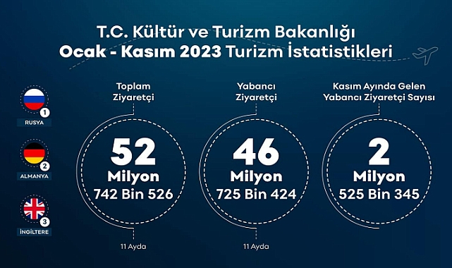 Türkiye 2023 yılının 11 ayında toplam 52 milyon 742 bin 526 ziyaretçi ağırladı. Gelen ziyaretçilerin 46 milyon 725 bin 424’ünü yabancılar, 6 milyon 17 bin 102’sini ise yurt dışı ikametli vatandaşlar oluşturdu.
