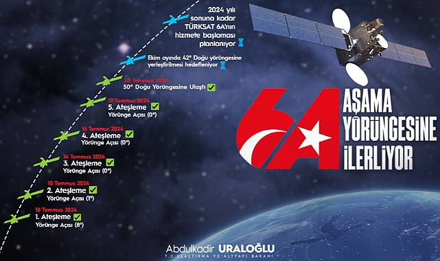 Bakan Uraloğlu, Türksat 6A’nın önemi nedeniyle uzay yolculuğunun her anının izlediklerini ifade ederek, uydunun bugün öğle saatleri itibariyle 50 derece Doğu test yörüngesine ulaştığını açıkladı. Şu anda Türksat 6A’nın dünyadan tam olarak 35 bin 786 kilometre uzakta bulunduğunu da kaydeden Uraloğlu, “Uydumuz 50 derece Doğu yörüngesine ulaştı ve antenlerini de ilk kez burada açtı. Yapılacak doğrulamaların ardından bu yörüngede 90 gün kalacak. 3 ay sonra Ekim 2024’te ise normal operasyona alınacağı 42 derece Doğu yörüngesine hareket ettirilecek. 42 derece Doğu yörüngesine doğru hareketinde de uydumuz 4 ateşleme daha yapacak” dedi. Türksat 6A’nın nihai kabulünün 42 derece Doğu yörüngesinde tamamlanmasının ardından yörünge testlerinin yapılacağını kaydeden Uraloğlu, “Daha sonra ise ülkemizin yerli ve milli ilk haberleşme uydusu Türksat 6A’yı ülkemizin ve milletimizin hizmetine vereceğiz” diye konuştu.