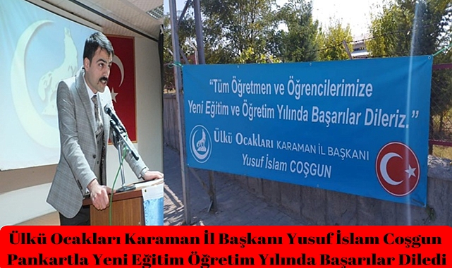 Ülkü Ocakları Karaman İl Başkanı Yusuf İslam Coşgun, Pankartla Yeni Eğitim Öğretim Yılında Başarılar Diledi.Ülkü Ocakları Karaman İl Başkanı Yusuf İslam Coşgun üniversite tarafına ''Tüm Öğretmen ve Öğrencilerimize Yeni Eğitim Öğretim Yılında Başarılar Dilerim.'' Pankartla Yeni Eğitim Öğretim Yılını Kutladı.