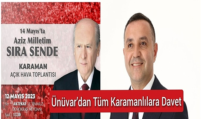 MHP Lideri Bahçeli’yi Karaman’da ağırlayacak olmaktan dolayı gururlu olduklarını belirten Ünüvar, ‘’Genel Başkanımız Devlet Bahçeli Bey, ‘Aziz Milletim Sıra Sende’ temalı açık hava toplantıları kapsamında 12 Mayıs Cuma Günü Karaman’da hemşehrilerimizle bir araya gelecek. Tüm Karamanlıları bu tarihi günde bizimle birlikte olmaya davet ediyorum’’ dedi. Hazırlıkların devam ettiğini ifade eden Ünüvar konuyla ilgili mesajında şu sözlere yer verdi;