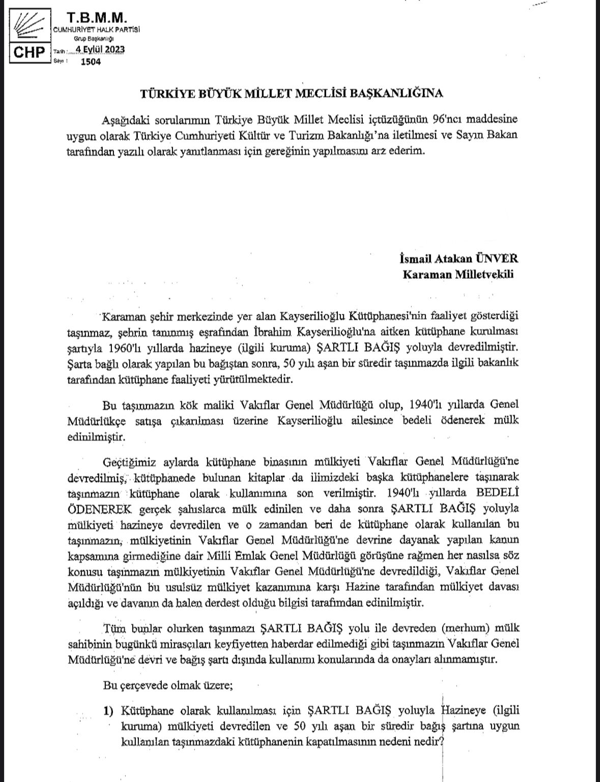 Cumhuriyet Halk Partisi Karaman Milletvekili Av. İsmail Atakan Ünver, Kültür ve Turizm Bakanı’nın yanıtlaması istemiyle TBMM’ye yazılı soru önergesi vererek, Karaman şehir merkezinde yer alan Kayserilioğlu Kütüphanesi’nin kapatılmasının sebebini sordu.