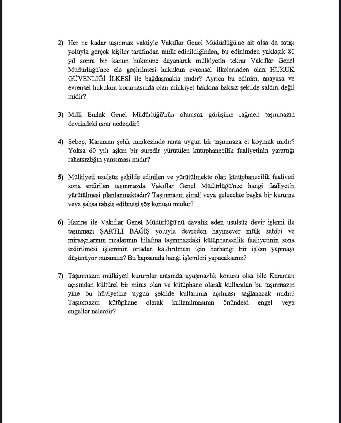 ÜNVER, KAYSERİLİOĞLU KÜTÜPHANESİ’Nİ MECLİS GÜNDEMİNE TAŞIDICumhuriyet Halk Partisi Karaman Milletvekili Av. İsmail Atakan Ünver, Kültür ve Turizm Bakanı’nın yanıtlaması istemiyle TBMM’ye yazılı soru önergesi vererek, Karaman şehir merkezinde yer alan Kayserilioğlu Kütüphanesi’nin kapatılmasının sebebini sordu.BİNA KÜTÜPHANE KURULMASI ŞARTIYLA BAĞIŞLANDITürkiye Büyük Millet Meclisi’ne sunduğu yazılı soru önergesinde, Karaman şehir merkezinde yer alan Kayserilioğlu Kütüphanesi'nin faaliyet gösterdiği taşınmazın, şehrin tanınmış eşrafından İbrahim Kayserilioğlu'na aitken kütüphane kurulması şartıyla 1960'lı yıllarda hazineye (ilgili kuruma) ŞARTLI BAĞIŞ yoluyla devredildiğini hatırlatan CHP Karaman Milletvekili Av. İsmail Atakan Ünver, şarta bağlı olarak yapılan bu bağıştan sonra, 50 yılı aşan bir süredir taşınmazda ilgili bakanlık tarafından kütüphane faaliyeti yürütüldüğünü belirtti.KÜTÜPHANE BİNASININ DEVRİ, MİLLİ EMLAK'A GÖRE KANUNA UYGUN DEĞİL!Kütüphane binasının 1940’lı yıllarda Vakıflar Genel Müdürlüğü’nce satışa çıkarıldığını, bunun üzerine Kayserilioğlu ailesince bedeli ödenerek mülk edinildiğini hatırlatan Ünver önergesinde, “Geçtiğimiz aylarda kütüphane binasının mülkiyeti Vakıflar Genel Müdürlüğü'ne devredilmiş, kütüphanede bulunan kitaplar da ilimizdeki başka kütüphanelere taşınarak taşınmazın kütüphane olarak kullanımına son verilmiştir. 1940'lı yıllarda BEDELİ ÖDENEREK gerçek şahıslarca mülk edinilen ve daha sonra ŞARTLI BAĞIŞ yoluyla mülkiyeti hazineye devredilen ve o zamandan beri de kütüphane olarak kullanılan bu taşınmazın, mülkiyetinin Vakıflar Genel Müdürlüğü'ne devrine dayanak yapılan kanun kapsamına girmediğine dair Milli Emlak Genel Müdürlüğü görüşüne rağmen her nasılsa söz konusu taşınmazın mülkiyetinin Vakıflar Genel Müdürlüğü'ne devredildiği, Vakıflar Genel Müdürlüğü'nün bu usulsüz mülkiyet kazanımına karşı Hazine tarafından mülkiyet davası açıldığı ve davanın da halen derdest olduğu bilgisi tarafımdan edinilmiştir.” ifadelerine yer verdi.VAKIFLAR GENEL MÜDÜRLÜĞÜ'NÜN TAŞINMAZI DEVRALMASINDAKİ ISRAR NEDEN?Kütüphane olarak kullanılan taşınmazı ŞARTLI BAĞIŞ yolu ile devreden (merhum) mülk sahibinin bugünkü mirasçılarının keyfiyetten haberdar edilmediği gibi taşınmazın Vakıflar Genel Müdürlüğü'ne devri ve bağış şartı dışında kullanımı konularında da onaylarının alınmadığını söyleyen Ünver, aşağıda yer alan soruları, Kültür ve Turizm Bakanı’nın yanıtlaması istemiyle TBMM Başkanlığı’na iletti.1) Kütüphane olarak kullanılması için ŞARTLI BAĞIŞ yoluyla Hazineye (ilgili kuruma) mülkiyeti devredilen ve 50 yılı aşan bir süredir bağış şartına uygun kullanılan taşınmazdaki kütüphanenin kapatılmasının nedeni nedir?2) Her ne kadar taşınmaz vaktiyle Vakıflar Genel Müdürlüğü'ne ait olsa da satışı yoluyla gerçek kişiler tarafından mülk edinildiğinden, bu edinimden yaklaşık 80 yıl sonra bir kanun hükmüne dayanarak mülkiyetin tekrar Vakıflar Genel Müdürlüğü'nce ele geçirilmesi hukukun evrensel ilkelerinden olan HUKUK GÜVENLİĞİ İLKESİ ile bağdaşmakta mıdır? Ayrıca bu edinim, anayasa ve evrensel hukukun korumasında olan mülkiyet hakkına haksız şekilde saldırı değil midir?3) Milli Emlak Genel Müdürlüğü'nün olumsuz görüşüne rağmen taşınmazın devrindeki ısrar nedendir?4) Sebep, Karaman şehir merkezinde ranta uygun bir taşınmaza el koymak mıdır? Yoksa 60 yılı aşkın bir süredir yürütülen kütüphanecilik faaliyetinin yarattığı rahatsızlığın yansıması mıdır?5) Mülkiyeti usulsüz şekilde edinilen ve yürütülmekte olan kütüphanecilik faaliyeti sona erdirilen taşınmazda Vakıflar Genel Müdürlüğü'nce hangi faaliyetin yürütülmesi planlanmaktadır? Taşınmazın şimdi veya gelecekte başka bir kuruma veya şahsa tahsis edilmesi söz konusu mudur?6) Hazine ile Vakıflar Genel Müdürlüğü'nü davalık eden usulsüz devir işlemi ile taşınmazı ŞARTLI BAĞIŞ yoluyla devreden hayırsever mülk sahibi ve mirasçılarının rızalarının hilafına taşınmazdaki kütüphanecilik faaliyetinin sona erdirilmesi işleminin ortadan kaldırılması için herhangi bir işlem yapmayı düşünüyor musunuz? Bu kapsamda hangi işlemleri yapacaksınız?7) Taşınmazın mülkiyeti kurumlar arasında uyuşmazlık konusu olsa bile Karaman açısından kültürel bir miras olan ve kütüphane olarak kullanılan bu taşınmazın yine bu hüviyetine uygun şekilde kullanıma açılması sağlanacak mıdır? Taşınmazın kütüphane olarak kullanılmasının önündeki engel veya engeller nelerdir?
