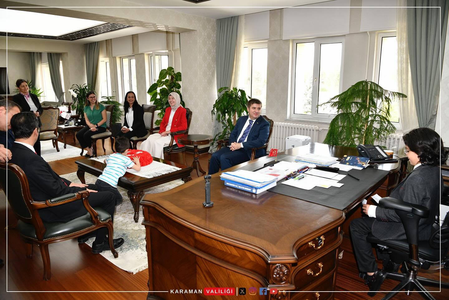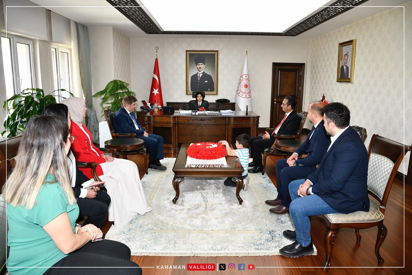 Valimiz H. Engin Sarıibrahim, 23 Nisan Ulusal Egemenlik ve Çocuk Bayramı dolayısıyla koltuğunu TOKİ Ortaokulu 5. Sınıf öğrencisi Recep Kaan Garip’e bıraktı.Ziyarette konuklarıyla bir süre sohbet ederek tüm dünya çocuklarının 23 Nisan Ulusal Egemenlik ve Çocuk Bayramını kutlayan Valimiz H. Engin Sarıibrahim, “Türkiye Cumhuriyetinin milli iradesinin tecelligahı olan TBMM’nin açıldığı gün 23 Nisan 1920. Bugün ülkemizin kurucusu Gazi Mustafa Kemal Atatürk tarafından ülkemizin geleceği olan siz gençlere emanet edildiği en önemli günlerden bir tanesi. Bizler demokrasiye, demokrasinin ortaya koyduğu sonuçlara sonsuz inanan gelişmiş toplumlarla beraber veya toplumlardan da önce demokratik kriterleri kendi içerisinde yaşamış bir millet olarak siz gençlere bunun emanet edilmesinden dolayı mutluluk duyuyoruz. Bugün sizin emir ve talimatlarınız doğrultusunda hem kamu kurumlarıyla hem diğer sivil toplum örgütleriyle birlikte çalışmaya gayret edeceğiz” şeklinde konuştu.Temsili olarak Valilik koltuğuna oturan Recep Kaan Garip, görevi devraldığı Valimiz H. Engin Sarıibrahim teşekkür ederek, “Makamların ve mevkilerin gelip geçici olduğunu belirterek bu koltıuklarda sizlere hizmet vermek için varız. Bizler bugün varız yarın yokuz. Fakat bu millet inşallah ilelebet sizlerin çabalarıyla varolacaktır. Geleceğin emanetleri olarak sizlerden beklentimiz vatanımız ve miletimzi her daim ileriye taşıyacak projelerle meşgul olmanız. Bugünün emanetçileri olarak bizlerde Sayın Cumhurbaşkanımızın dediği gibi sizlerin okuması, düşünmesi, uygulaması ve neticelendirmesi için üstümüze düşeni yapmakla yükümlüyüz. Son olarak tüm dünya çocuklarına Atamızın armağan ettiği bu kutlu günümüzü çocukluklarını yaşayamadan hayatanı kaybeden Gazzeli çocuklara ithaf ediyorum” dedi.