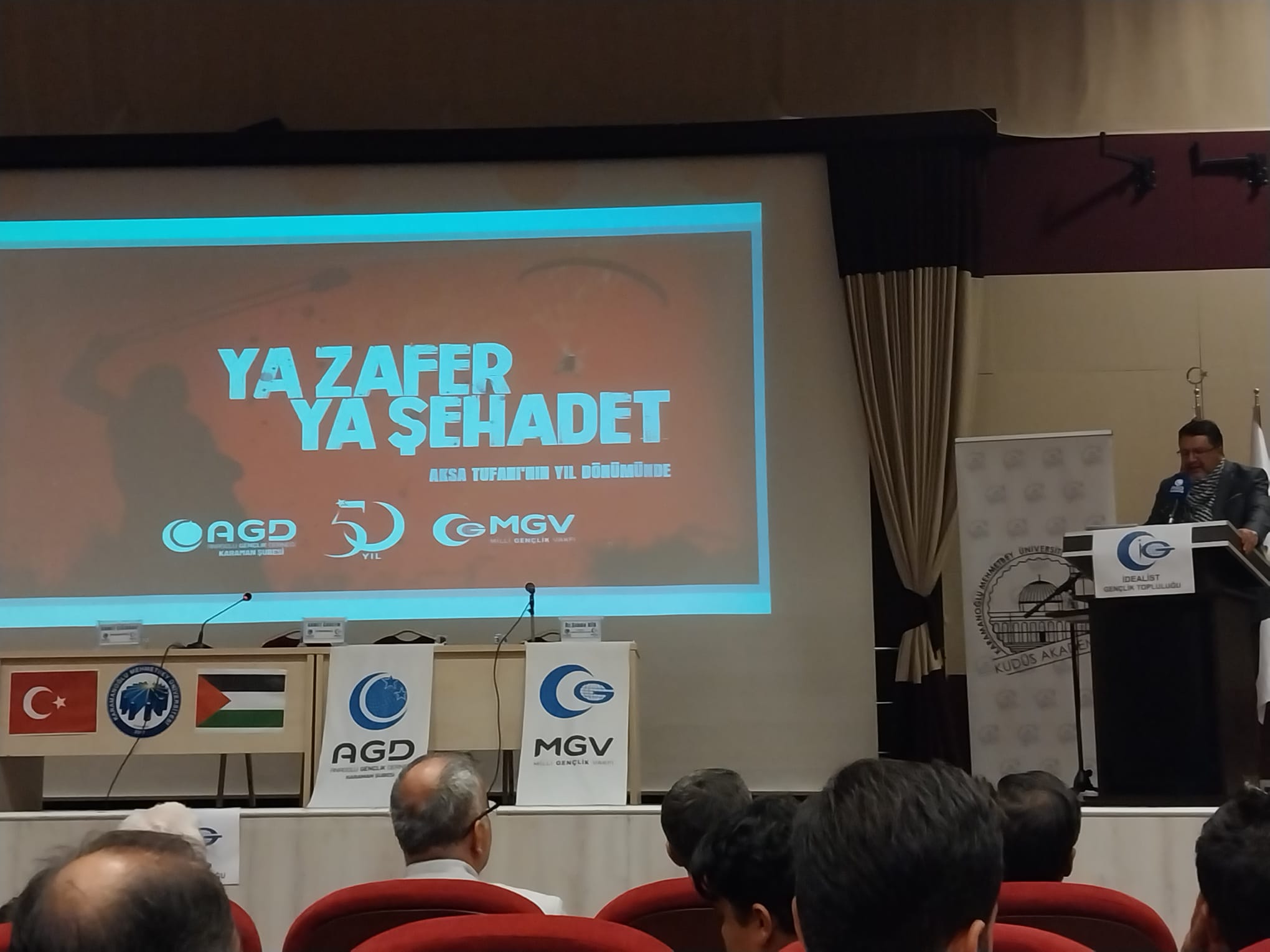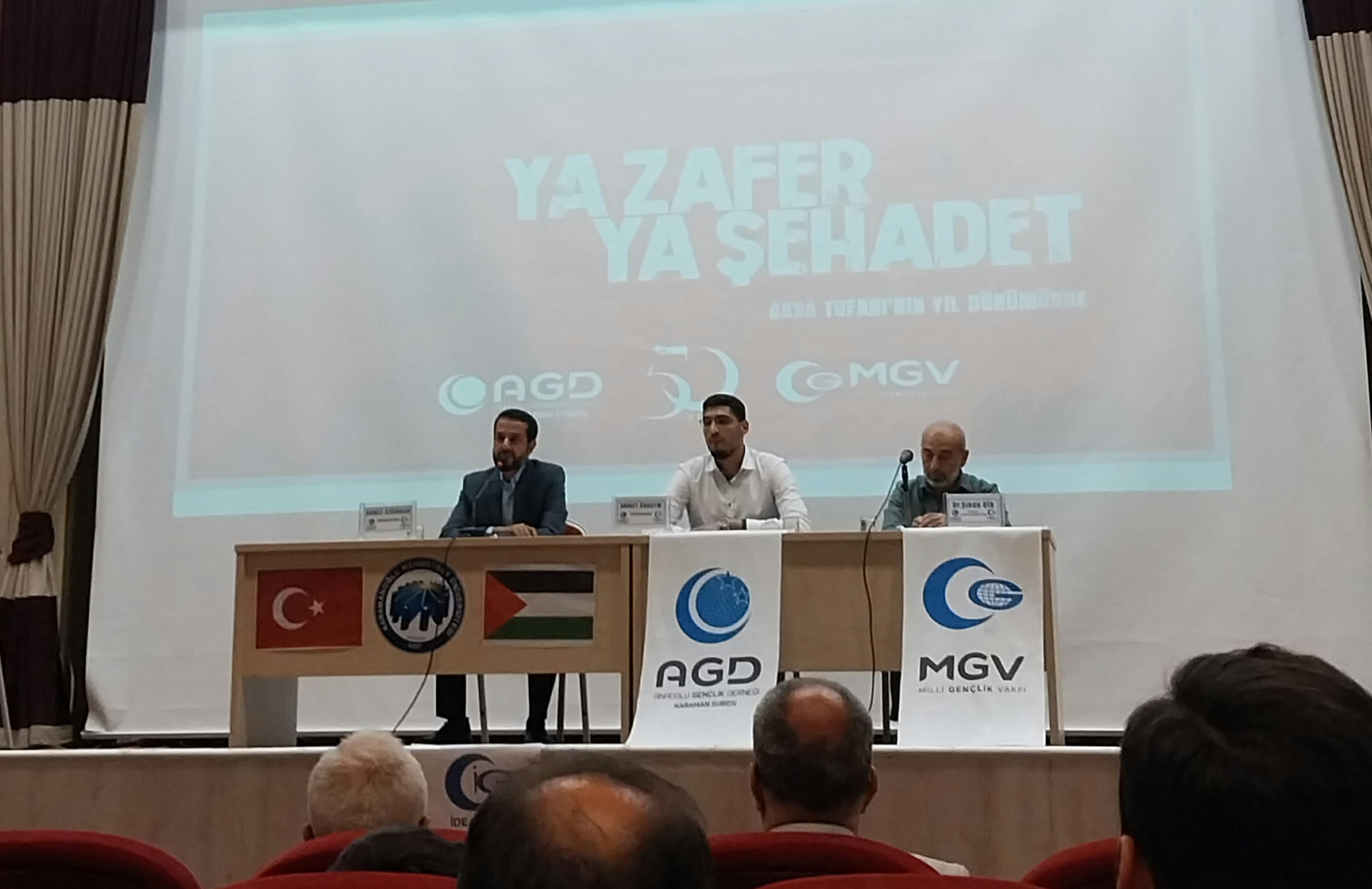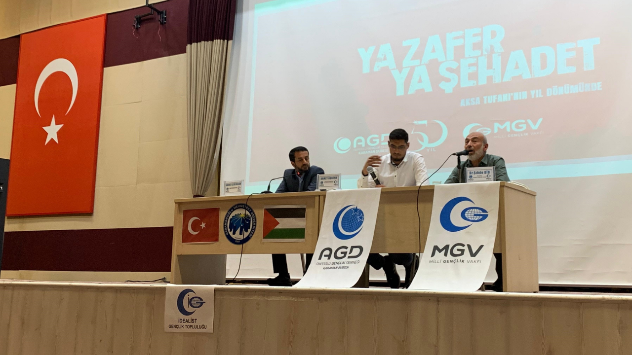 AGD Karaman Şubesi ve KMÜ İdealist Gençlik Topluluğu tarafından düzenlenen "Ya Zafer Ya Şehâdet" konferansı KMÜ Şehit Ömer Halisdemir Konferans Salonunda gerçekleştirildi.Hafız Kayra Aydemir’in Kur’an-ı Kerim tilâvetiyle başlayan programda AGD Karaman Şube Başkanı Şabettin Gezen bir selamlama konuşması yaptı. Sinevizyon gösteriminin ardından AGD İzcilik Kulübü öğrencilerinden Mahmud Zahid Şahbaz Kudüs ve Mescid-i Aksa için ezgiler seslendirdi.Programın konferans bölümünde Filistin mücadelesiyle ilgili siyonist algının etkisiyle zihinleri bulandıran sorular Filistin Alimler Birliği Üyesi Dr. Şıhde Dîb tarafından cevaplandı.