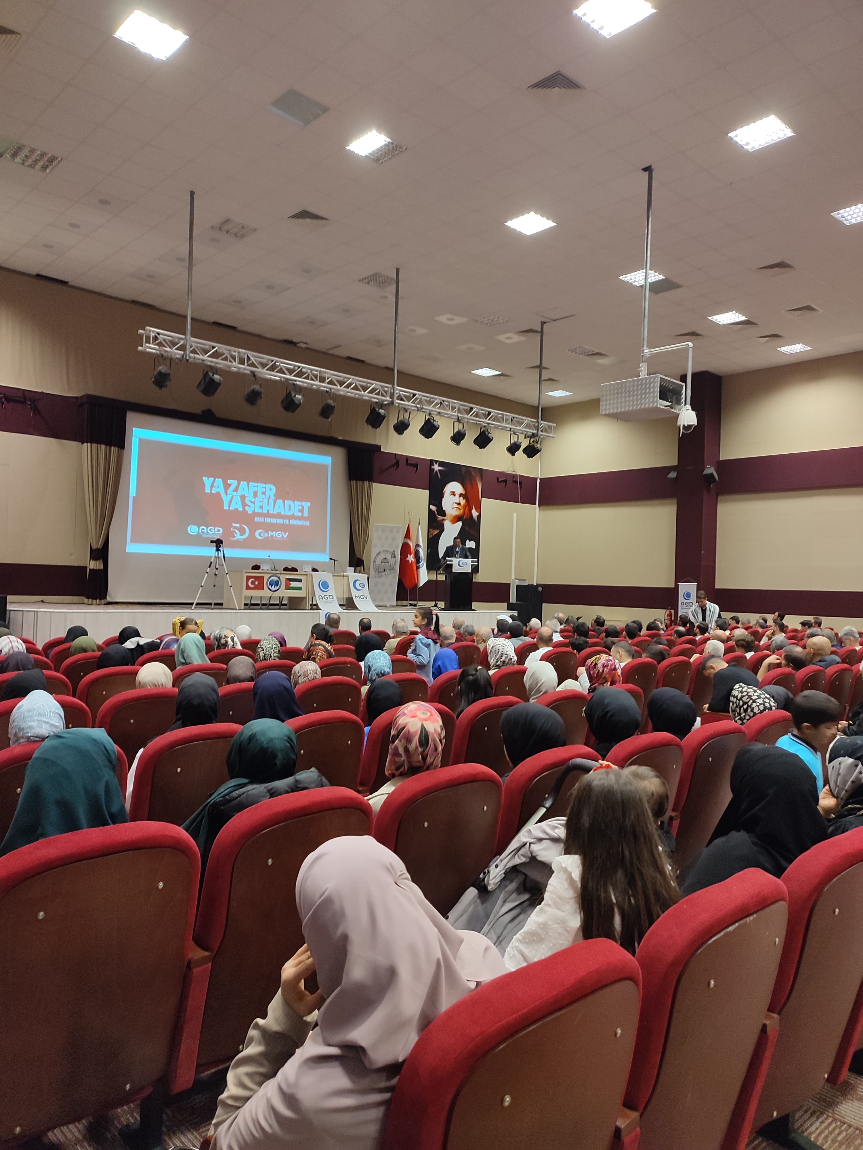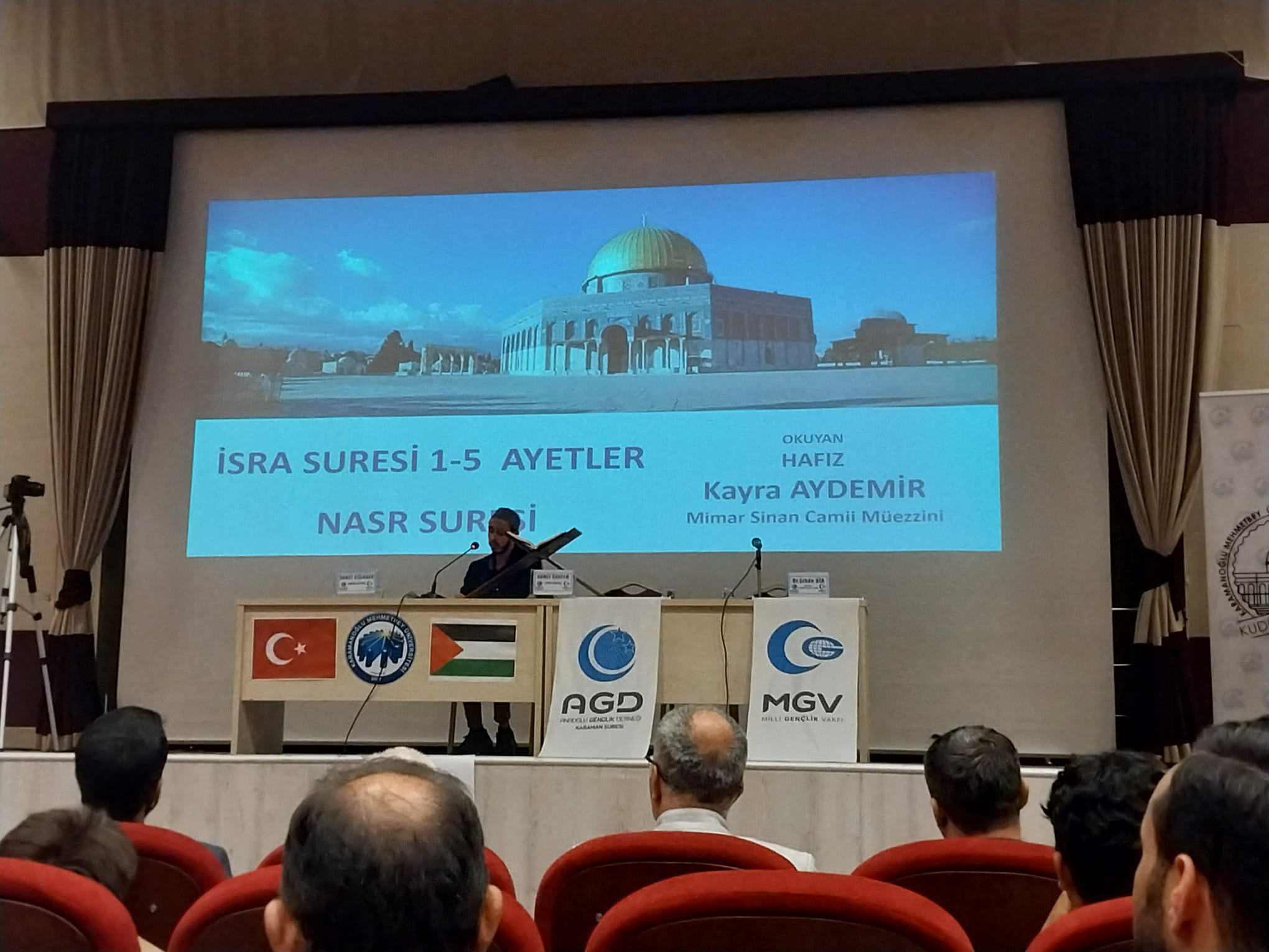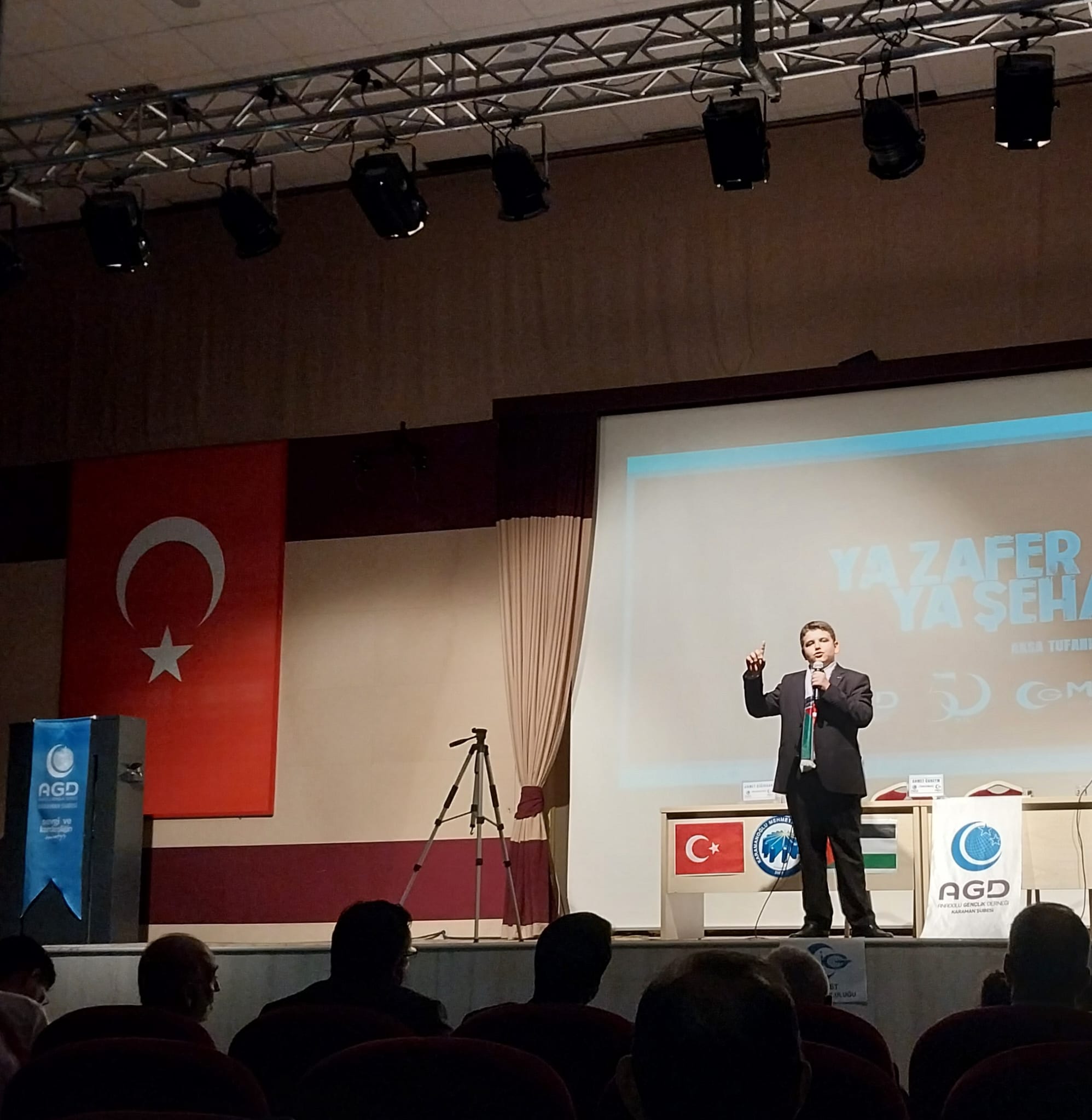 AGD Karaman Şubesi ve KMÜ İdealist Gençlik Topluluğu tarafından düzenlenen "Ya Zafer Ya Şehâdet" konferansı KMÜ Şehit Ömer Halisdemir Konferans Salonunda gerçekleştirildi.Hafız Kayra Aydemir’in Kur’an-ı Kerim tilâvetiyle başlayan programda AGD Karaman Şube Başkanı Şabettin Gezen bir selamlama konuşması yaptı. Sinevizyon gösteriminin ardından AGD İzcilik Kulübü öğrencilerinden Mahmud Zahid Şahbaz Kudüs ve Mescid-i Aksa için ezgiler seslendirdi.Programın konferans bölümünde Filistin mücadelesiyle ilgili siyonist algının etkisiyle zihinleri bulandıran sorular Filistin Alimler Birliği Üyesi Dr. Şıhde Dîb tarafından cevaplandı.